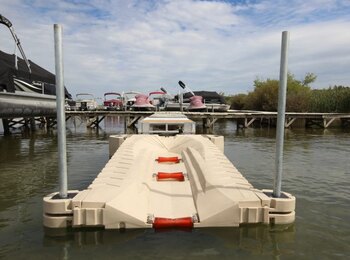 ShorePort can be attached to nearly any floating dock system, and ShorePort works great with any standing or wheel-in style dock system. Simply position the ShorePort alongside, or perpendicular to your dock system for quick and convenient access to your jetski or waverunner.